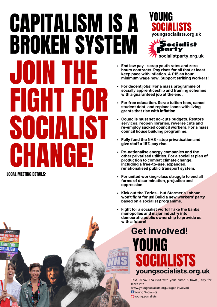 Young Socialists and the Socialist Party say it is vital any such party is armed with a socialist programme. The struggle for above inflation pay rises, proper funding for our NHS, mass council house building, decent and well paid jobs will be fought against bitterly by big business both in Britain and internationally.